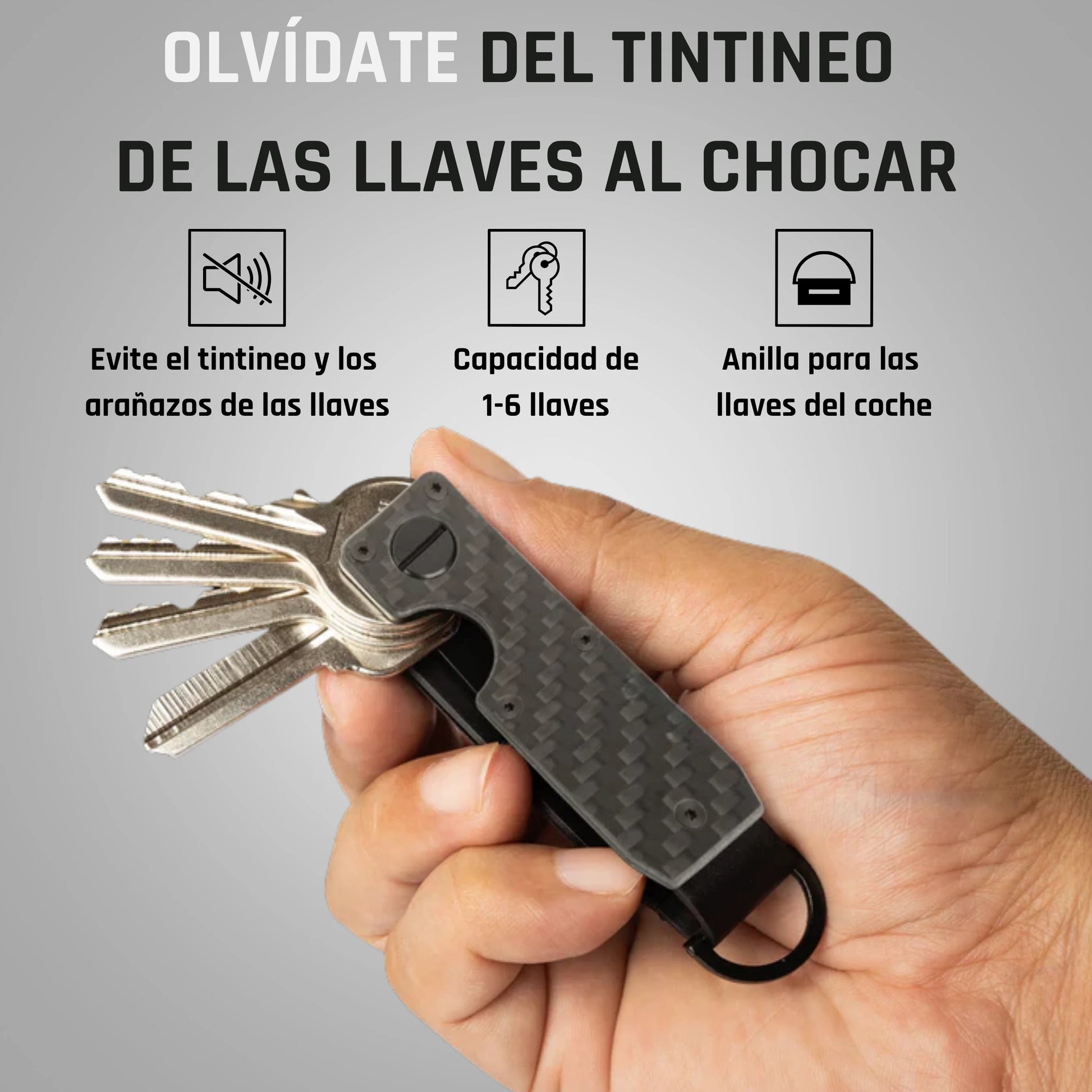 Fabricado en fibra de carbono ultra resistente, este llavero minimalista no solo mantiene tus llaves seguras y silenciosas, sino que también incorpora múltiples sistemas de anclaje que lo hacen ideal para el uso diario o profesional.